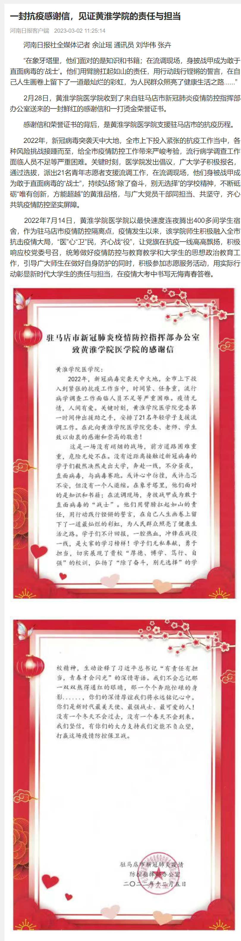 感谢信和荣誉证书的背后,是金年会app手机版在线登录学院医学院支援驻马店市的抗疫历程。